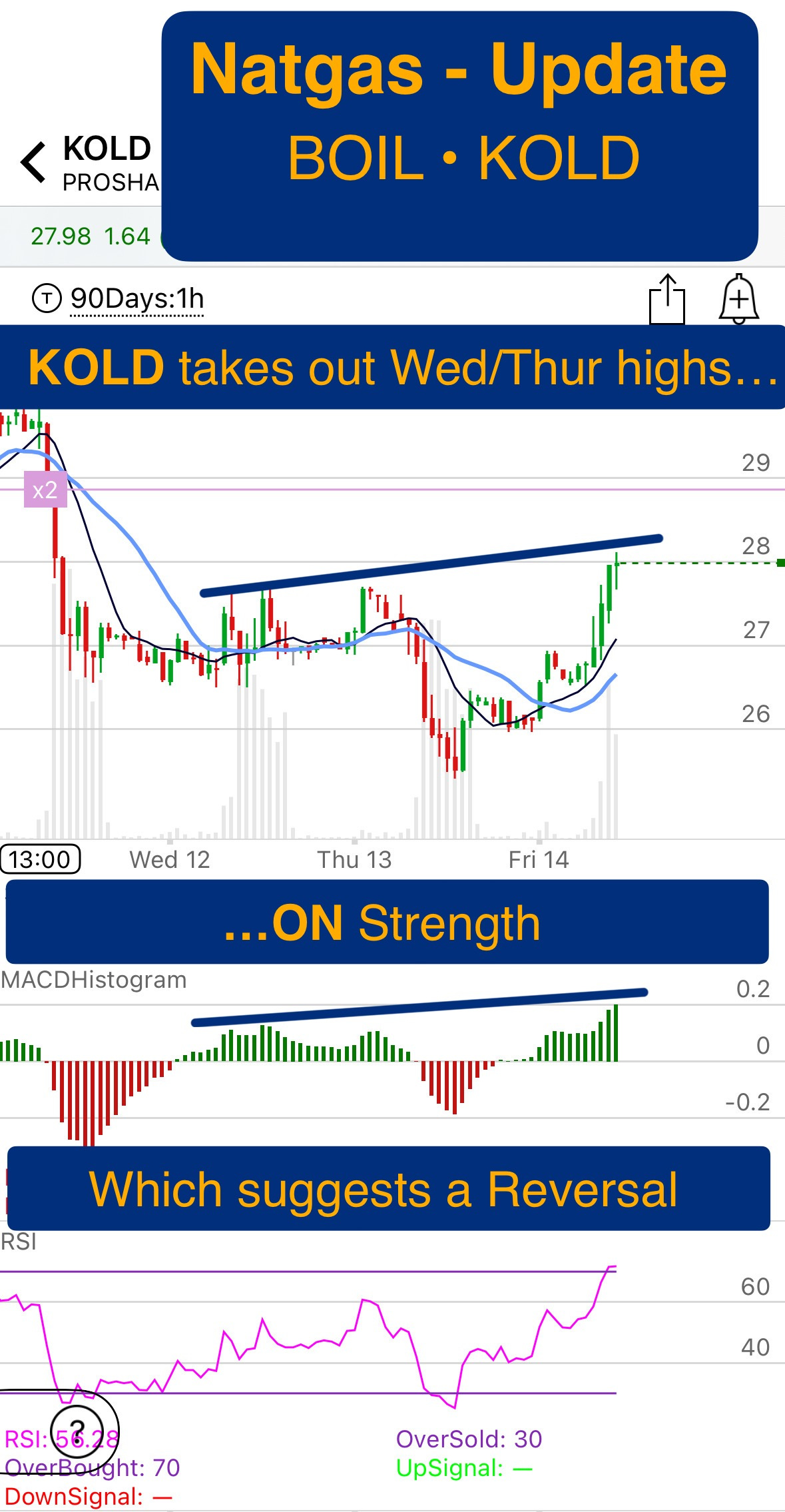 Well, today KOLD has taken out highs of Wednesday and Thursday on strength. For those who held short Natural Gas in KOLD, I commend you and your stubborness. I also commend those of you wise enough to exit this grueling beast of a trade.