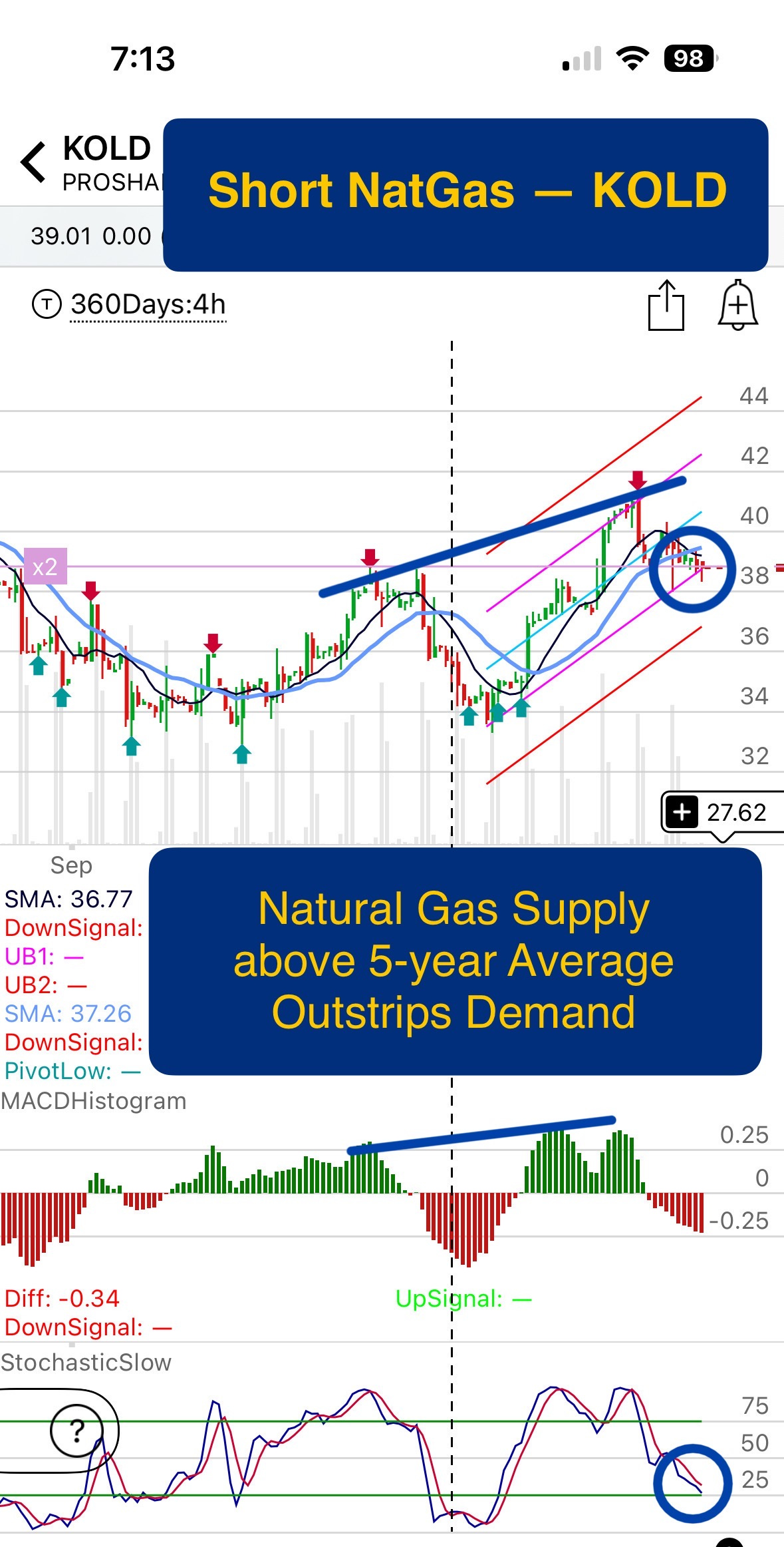 Although we would rather be building a long Natty Gas position, moving into the fall and winter demand season, it looks like KOLD is the play. KOLD is an ETF which can be used to short Natural Gas.