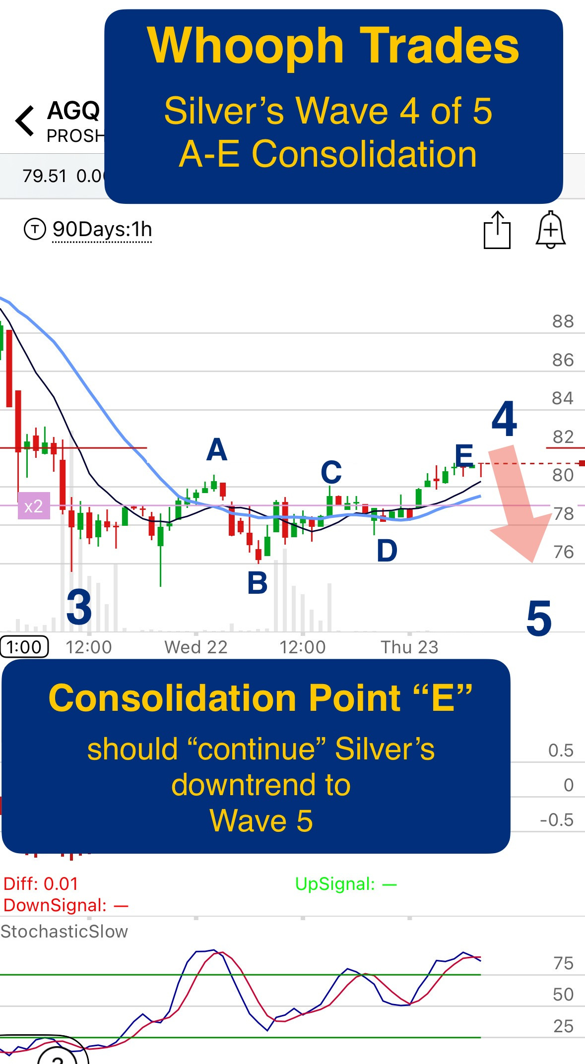 While Whooph is SHORT Silver, he continues to watch and dissect its wave structure and consolidation in Wave 4. Whooph’s short was temporarily flattened with an equivalent long overnight as Price mounted its gentle trek upward from Consolidation point D to Consolidation point E (annotated below).