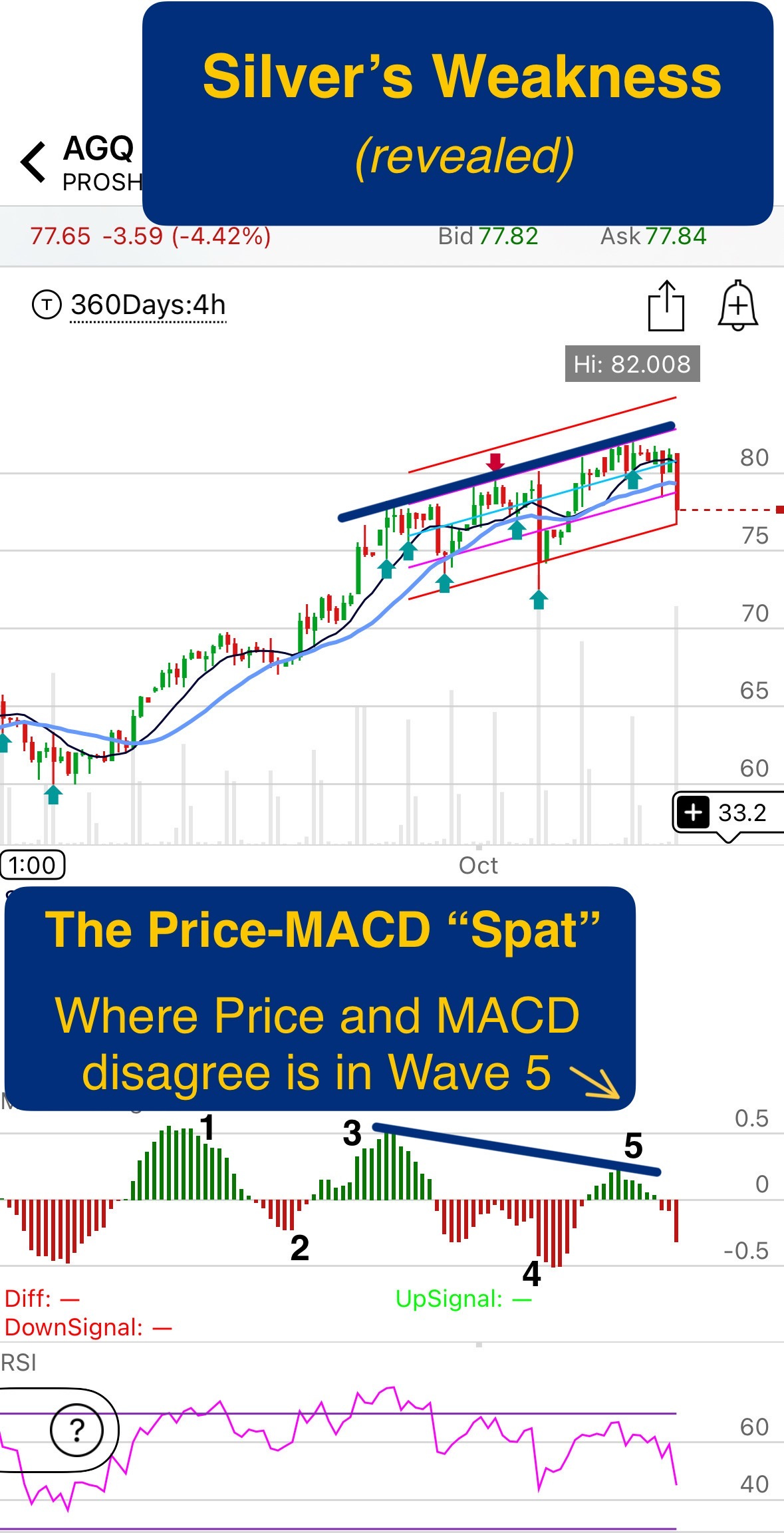 Now again, 1-week ago in AGQ you can see the “SPAT” developing between Price and MACD.