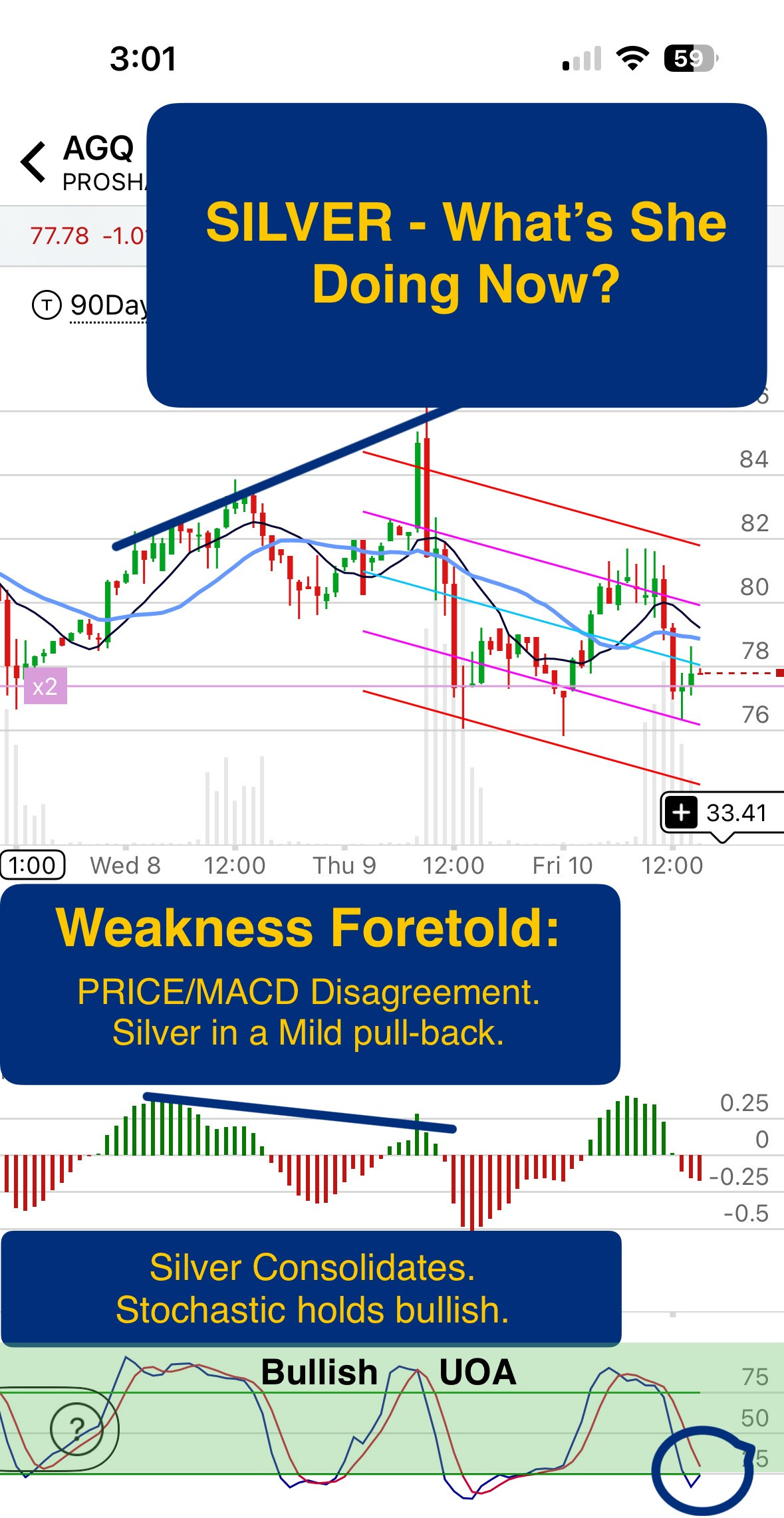 ANALYSIS on the 4hr and Daily charts says Silver is working off her topside weakness in (sideways) consolidation, with only a mild pull-back.