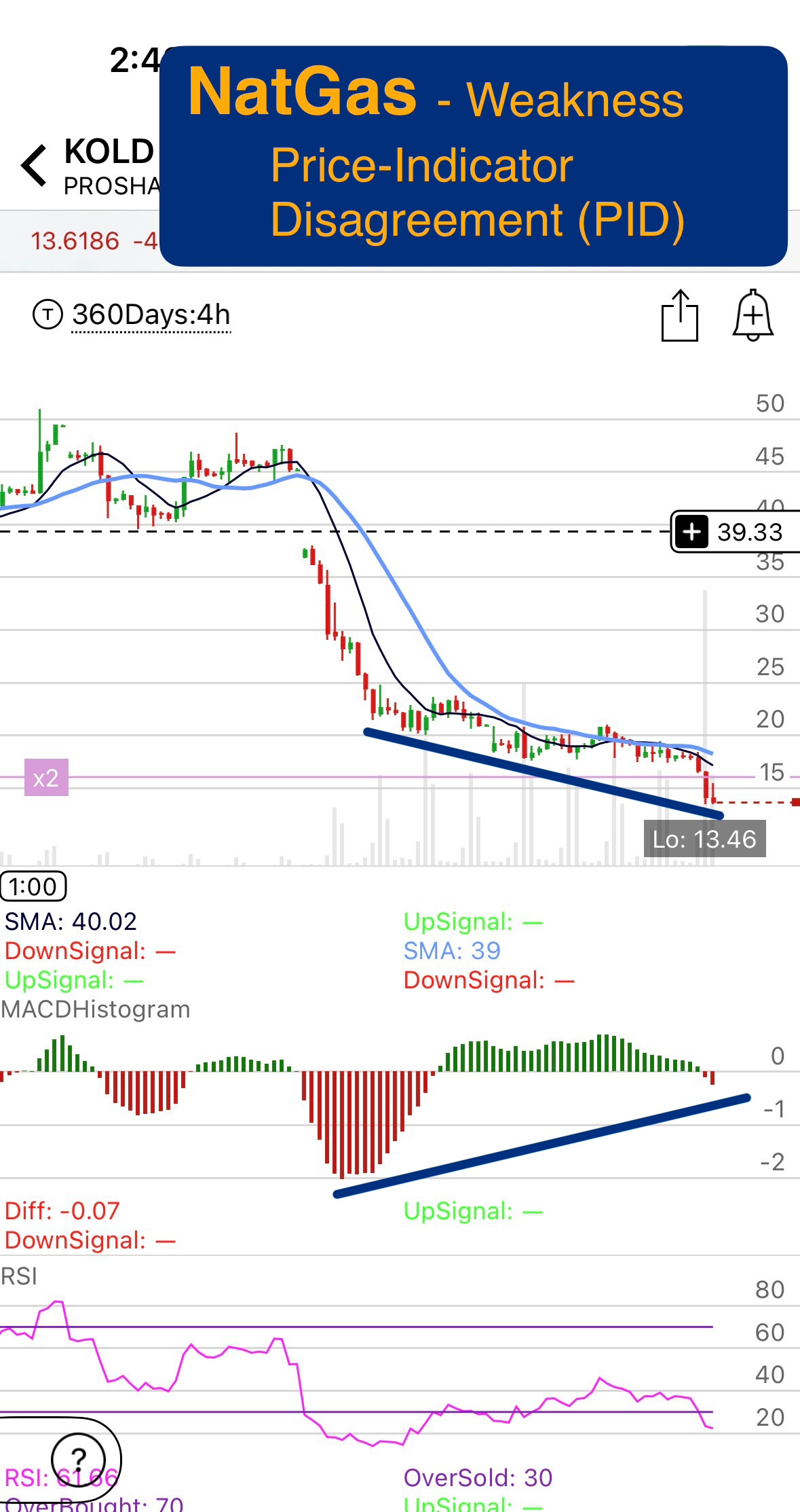 On Price-Indicator Disagreement or weakness upon that move we added to our short position in KOLD. Whooph anticipates a second red bar at @ 1:00 pm EST on the MACD indicator will confirm weakness or disagreement with the new Price high.