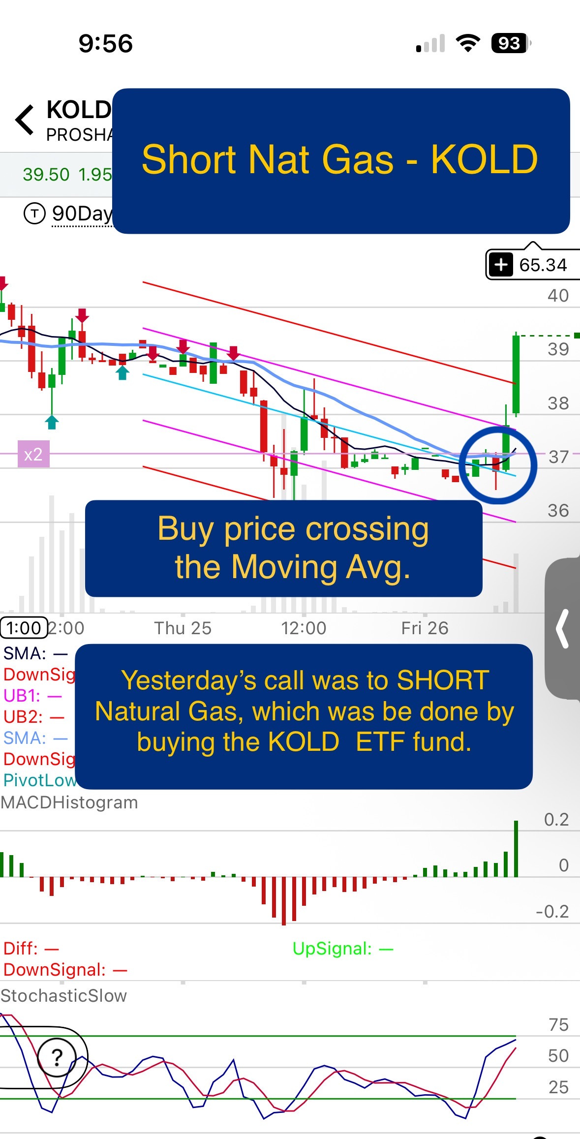 Whooph’s Natural Gas SHORT position in KOLD is currently in Wave 1 of 5, having just crossed the Moving Average. So, he can watch for weakness and take short-term profits at the top of Wave 1 or simply hold through Waves 1 (up), Wave 2 (pull-back), Wave 3 (up), Wave 4 (pull-back), and SELL in Wave 5. All depends on a trader’s Time v. Income needs and a trader’s personal preference.